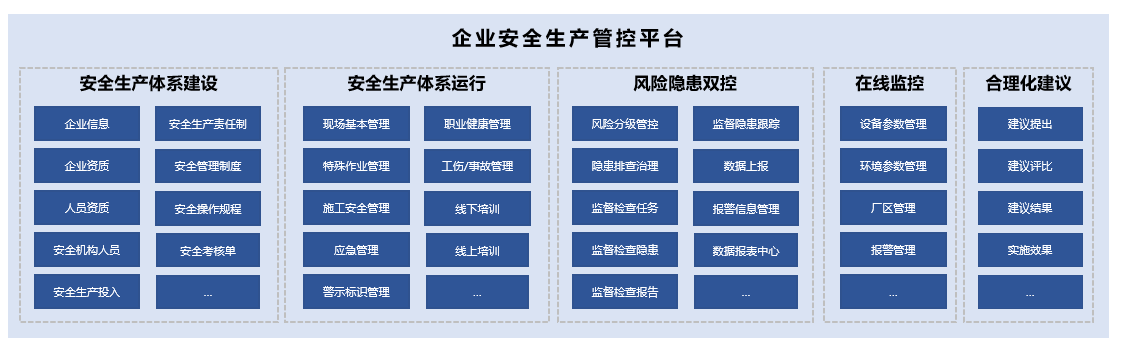企业安全生产管控平台,涵盖安全生产体系建设、安全生产体系运行、风险隐患双控、现场监测联动预防、合理化建议5个主要业务领域。