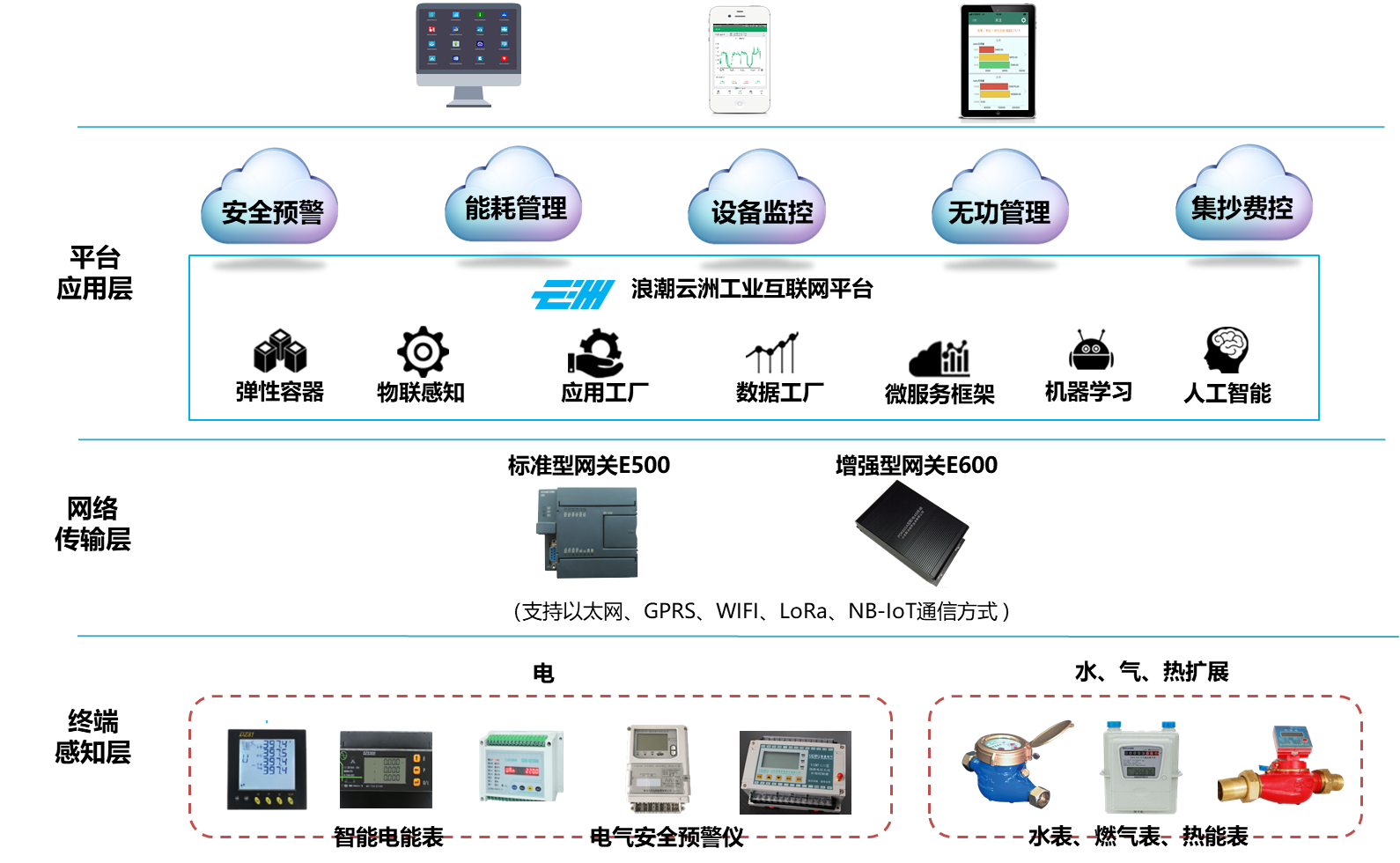 智慧能源管理业务主要包括如下类别:安全预警、能耗管理、设备监控、集抄费控,图为业务架构 终端感知层给予主要是现场的水表、燃气表、热能表,以及安装在现场的智能电表、电气安全预警仪等 网络传输层主要是指给予工业网关,负责终端智能表计与平台应用层的连接,实时采集设备数据,上报到云上的物联网服务 平台应用层基于Ebpay创新云洲工业互联网平台搭建,给予面向能源管理领域的特定场景应用。平台给予虚拟化、物联感知、应用工厂、数据工厂、微服务、机器学习、人工智能等服务能力,支撑智慧能源管理应用 应用层给予安全预警、能耗管理、设备监控、无功管理、集抄费控等功能,服务安全用能、经济用能以及精细化管理的需求,同时支持PC端和移动端(IOS、Android)访问,满足不同用户群体使用需求